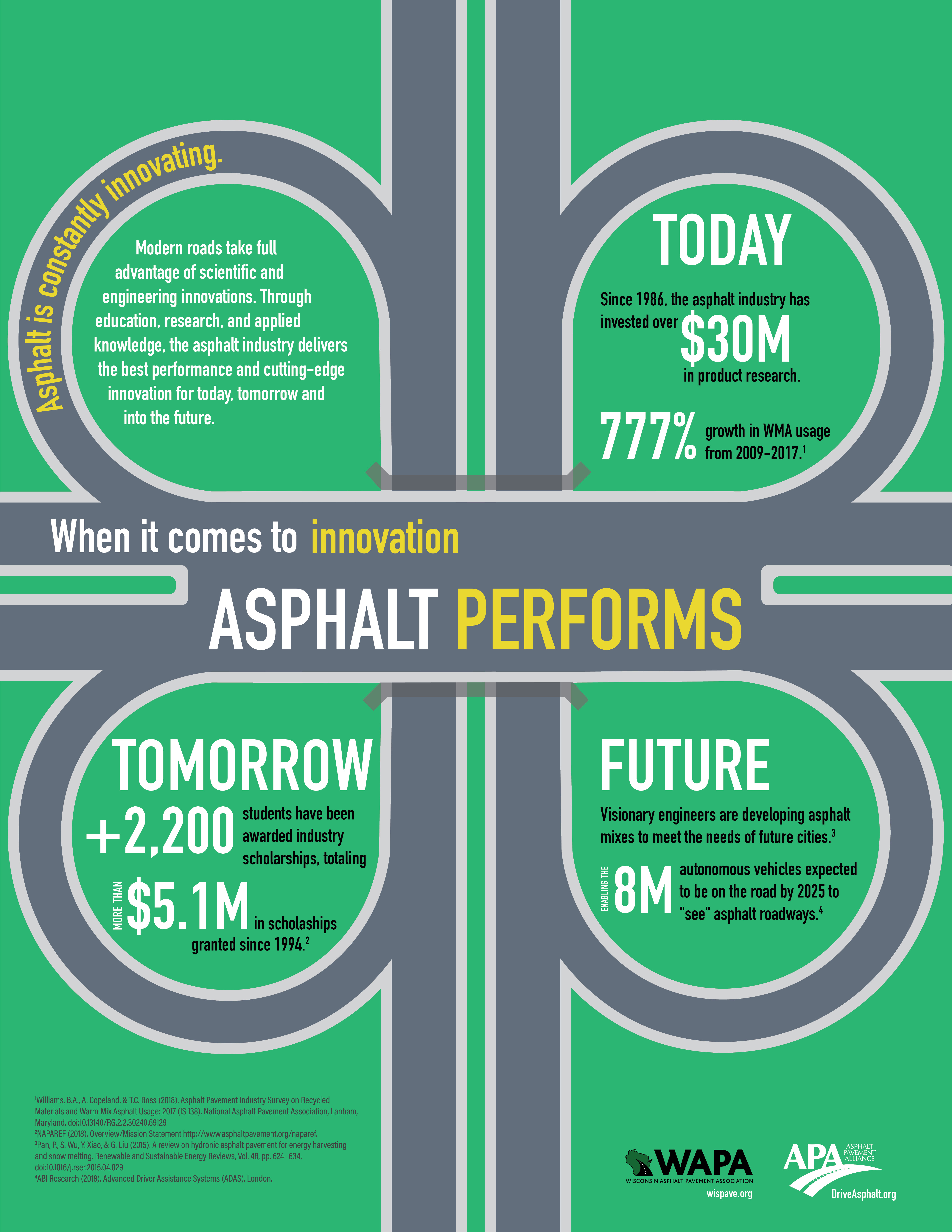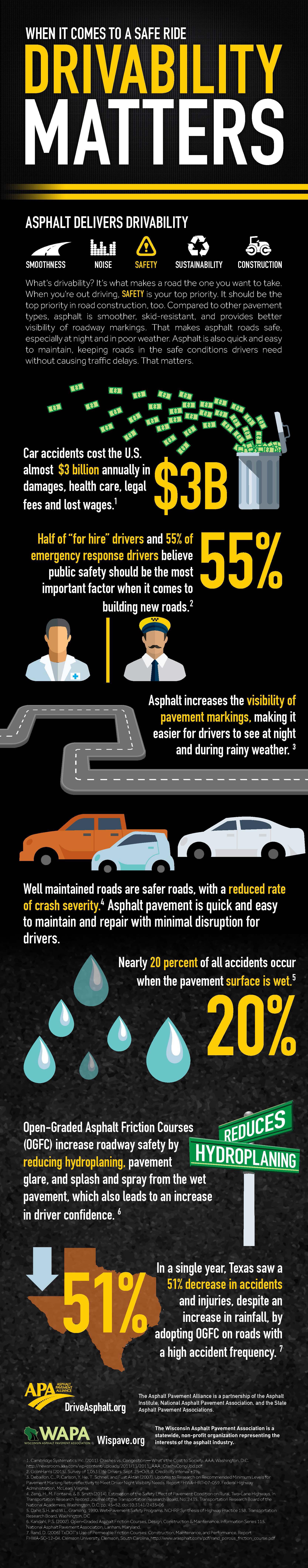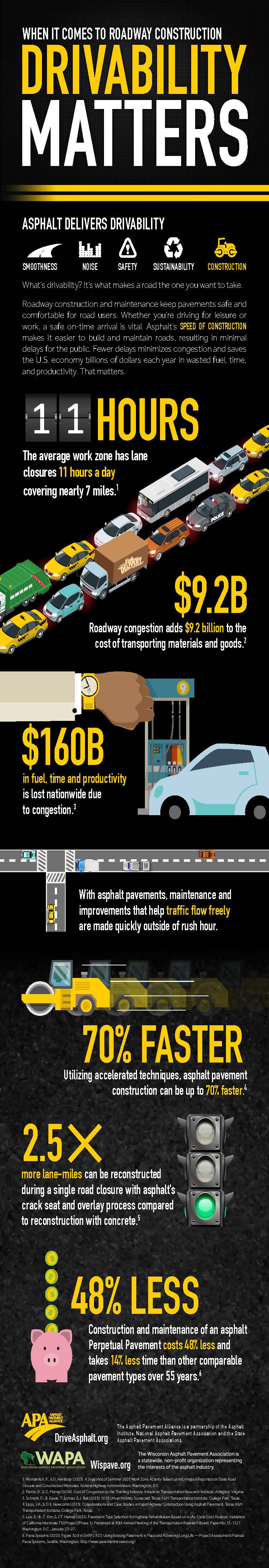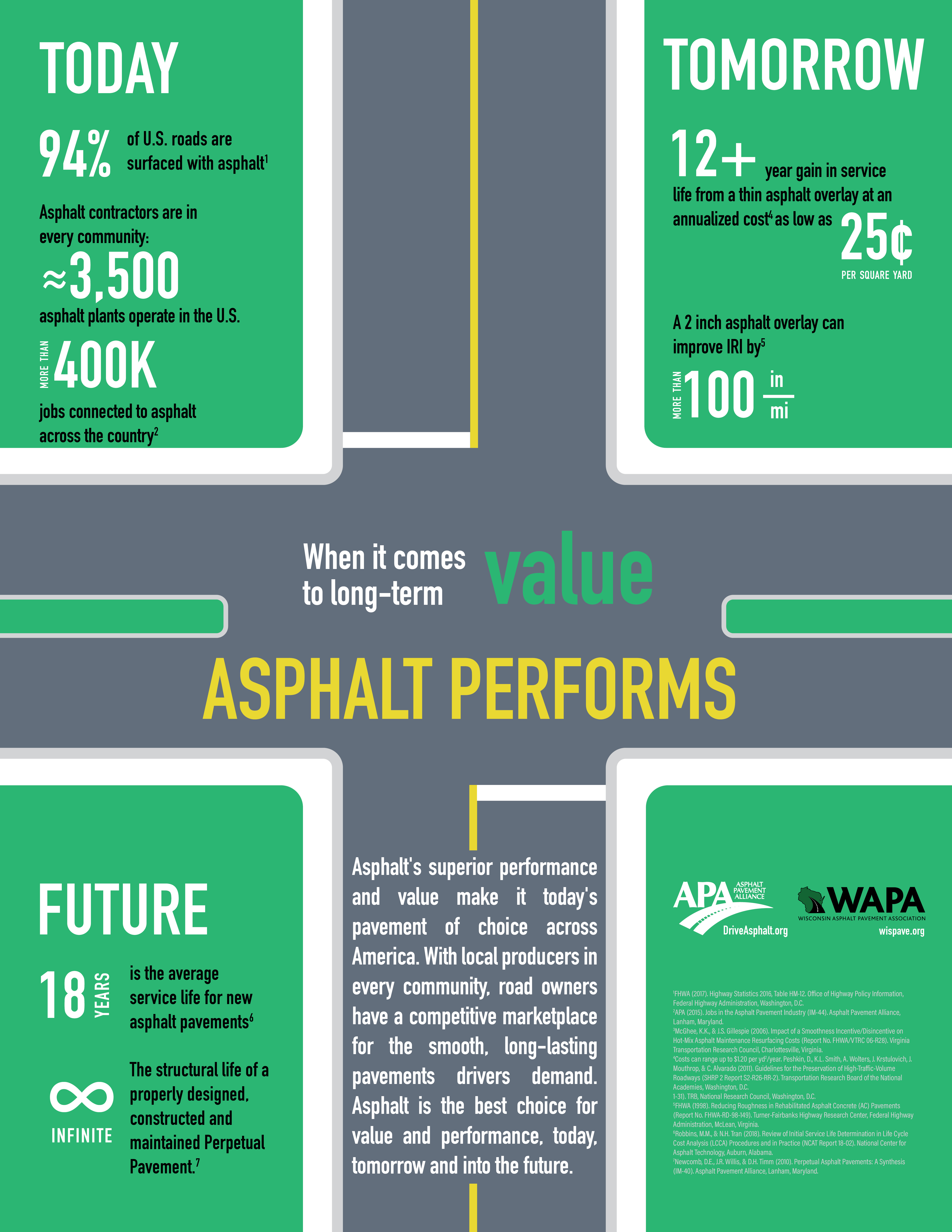 High-impact graphics tell the drivability story for asphalt in “infographic” format. These files from Asphalt Pavement Alliance are branded with WAPA’s logo and information. Click any infographic to expand to full size.